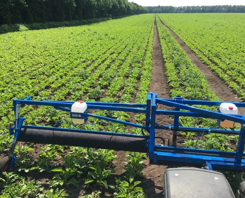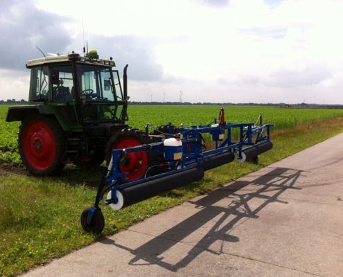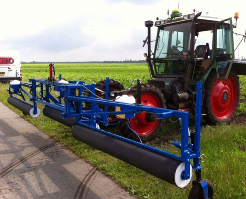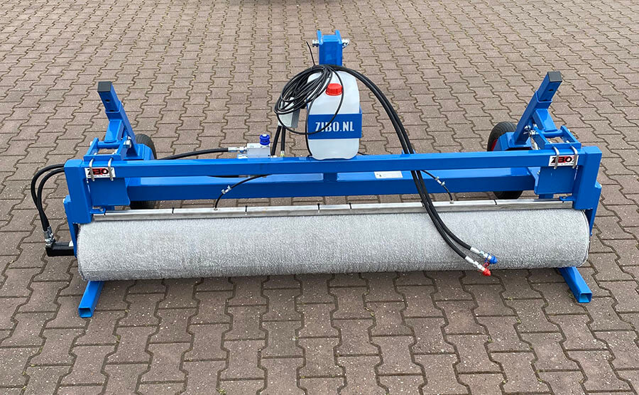 L’applicateur d’herbicides ZIBO comprend un tuyau libre recouvert d’une tôle spéciale. Un rouleau rotatif offre une capacité accrue et permet d’éviter les points d’égouttement. En conséquence, l’applicateur rotatif peut aussi être utilisé sur des cultures adultes. La version d’une largeur de fonctionnement de 3 mètres est dotée d’un bras rotatif. La version d’une largeur de fonctionnement de 6 mètres est dotée de 3 bras rotatifs de 2 mètres ; elle est rabattable. Un rouleau rotatif offre une capacité accrue et le désherbage ne dépend donc pas du rang. La quantité d’humidité de chaque rouleau peut être définie depuis la cabine. L’applicateur rotatif dispose de série d’un système de nivellement qui maintient le rouleau à l’horizontale