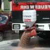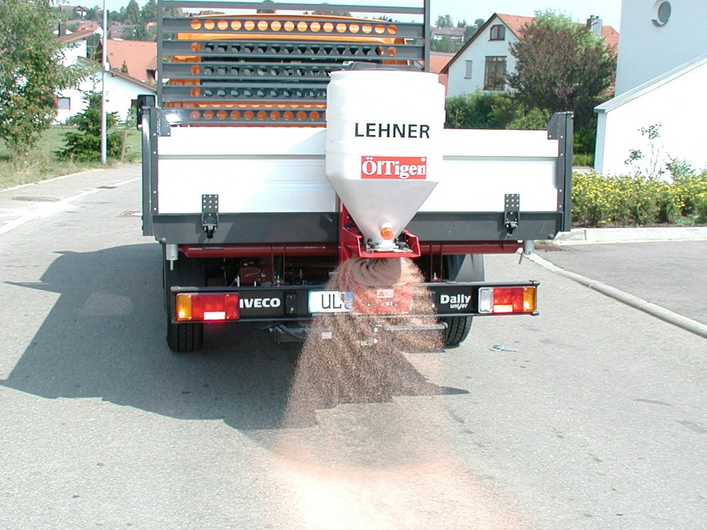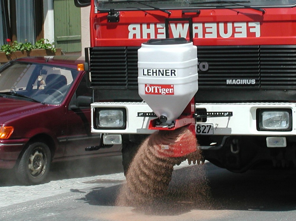 Lehner Öltiger voor het strooien van (korrels) oliebindmiddel. U kent het probleem van oliesporen, hulpverleners gaan te voet over de weg om het oliebindmiddel te strooien. Door handwerk wordt het oliebindmiddel ongelijkmatig verdeeld en moet men de korrels later met een veger gelijkmatig op het wegdek aanbrengen. Hierdoor kunnen gevaarlijke situaties onstaan op de weg.